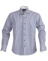 - Striped pattern as body fabric with contrast fabric under collar, placket and bottom sleeve